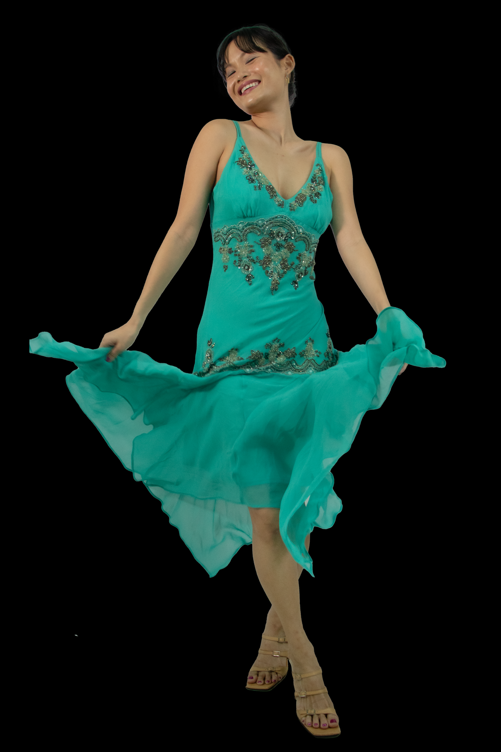 This gorgeous green dress features delicately sewn glass beads and a flouncy hemline that evokes that Great Gatsby vibe. It was most likely a custom made creation back in the ‘70s since there was no tag and/or brand.
