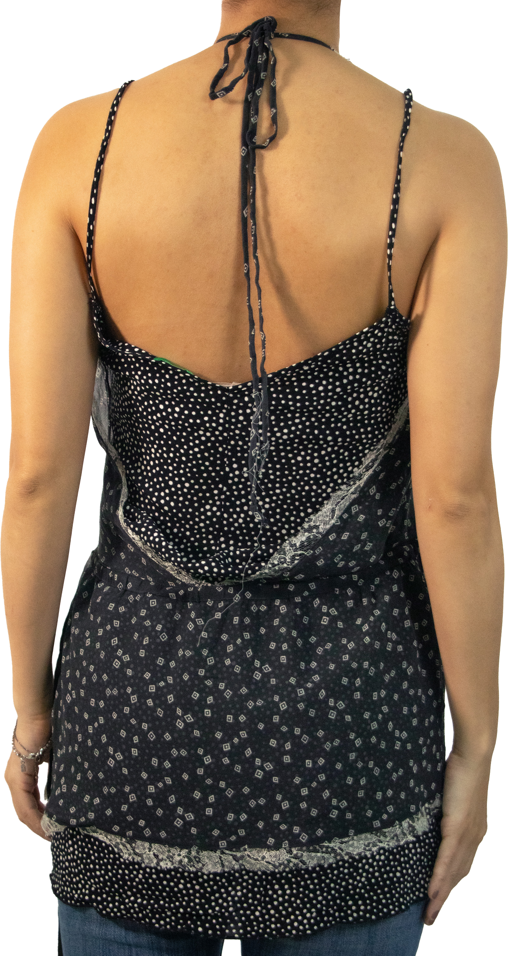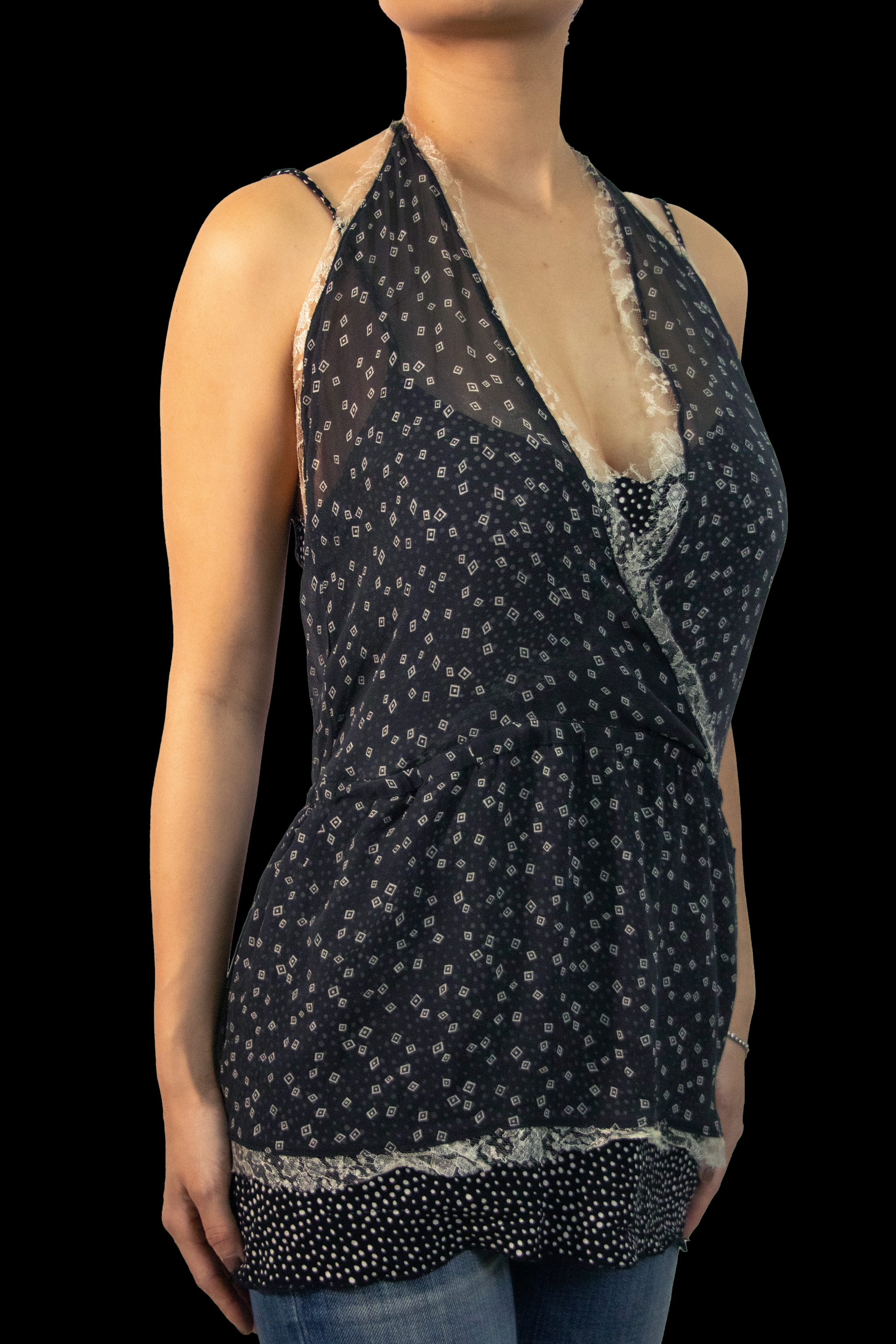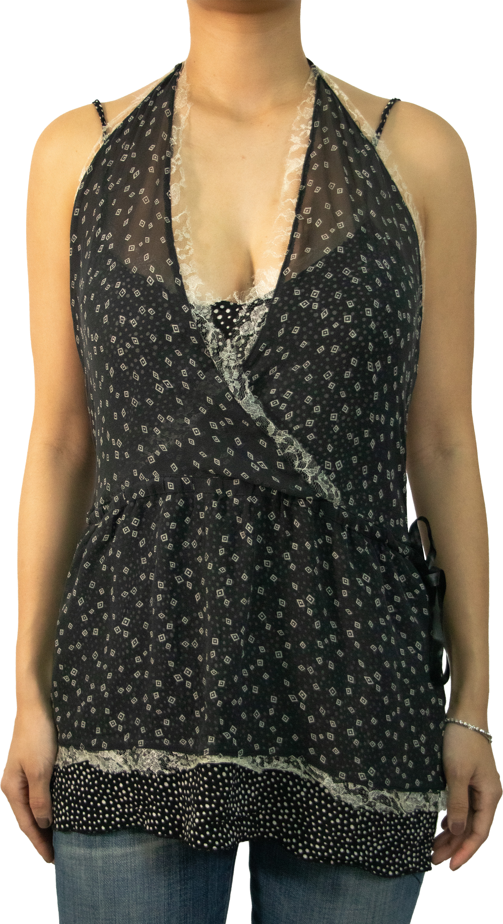 A Y2K staple, the layered top is a must-have in everyone’s wardrobe - yours included. This camisole halter top hybrid was a unique design to have for what it is. Make it modern with a pair of straight leg jeans and sandals!