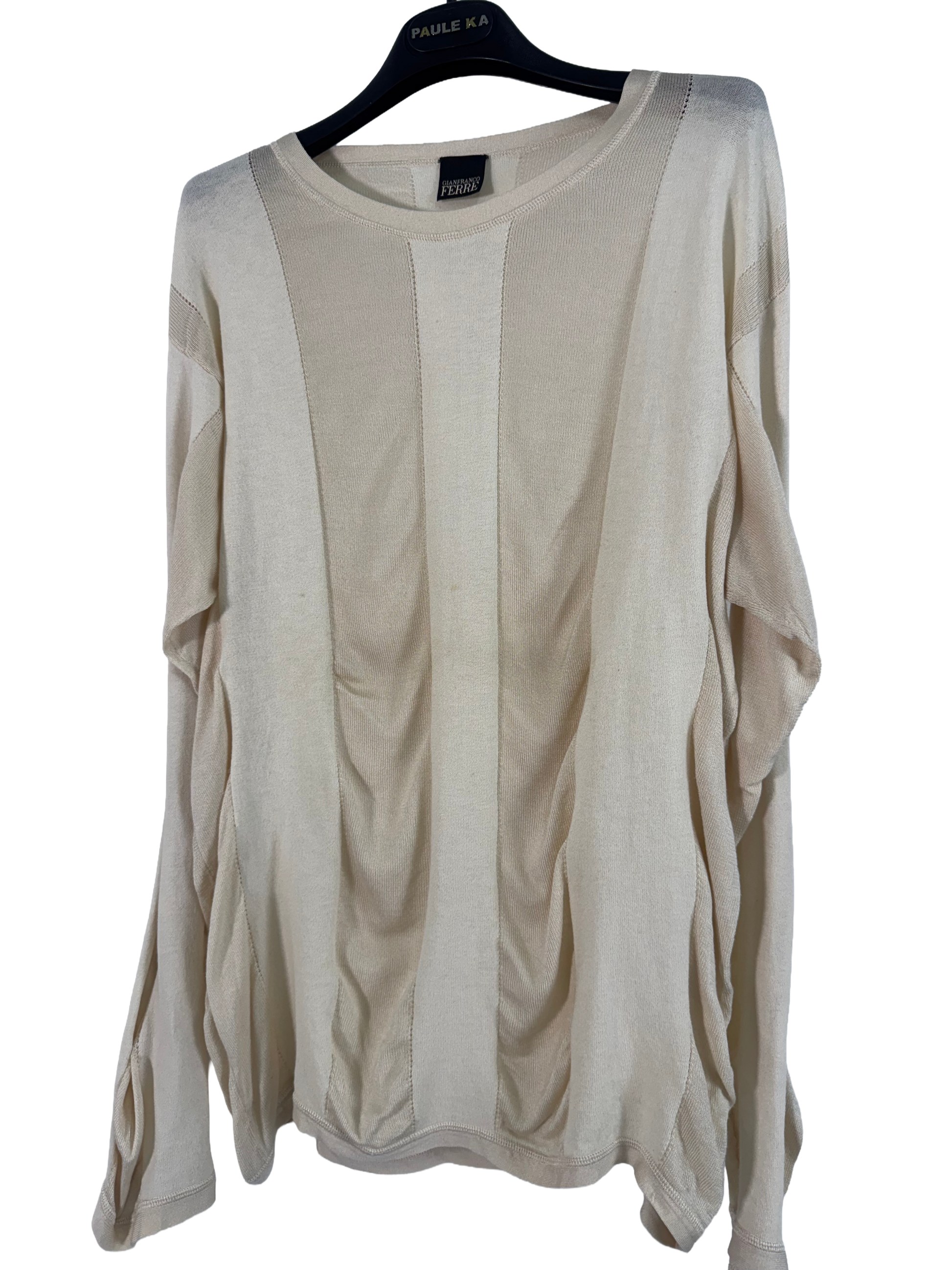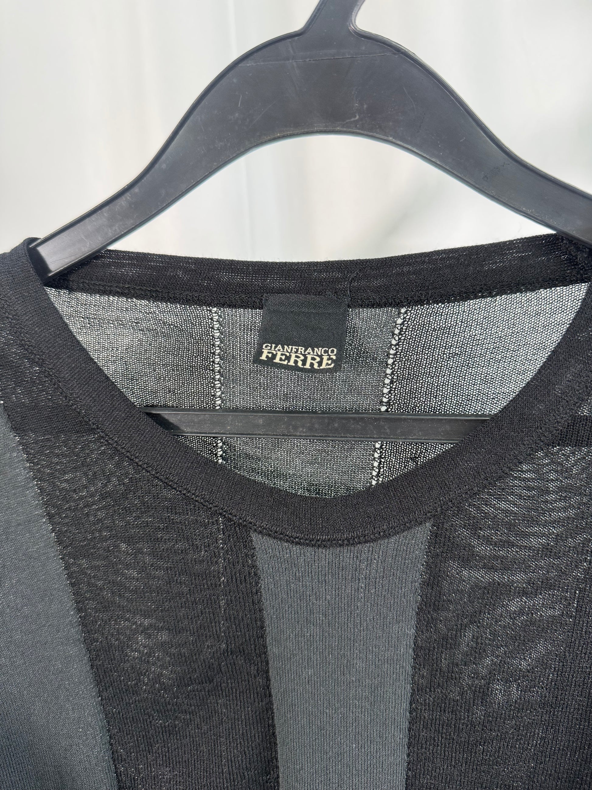 This pullover mixes minimalism with a little mystery — featuring tonal black panel stripes and subtly sheer finish that catches the light just right. It’s giving Italian cool meets downtown edge.