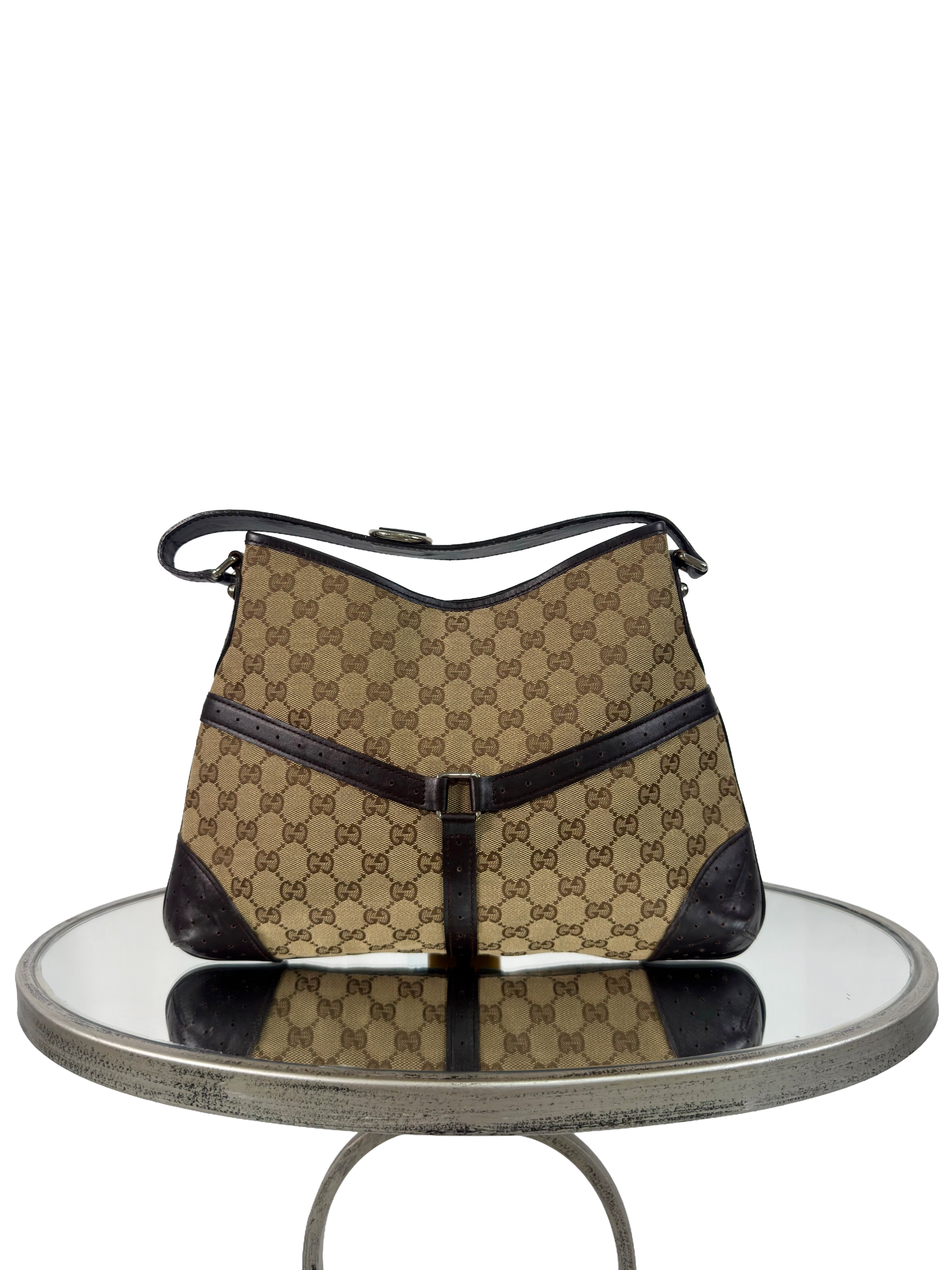 Straight outta the archives and dripping in classic Italian luxury, this vintage piece is serving timeless realness. Crafted in the iconic GG monogram canvas with rich chocolate brown leather accents, and flaunting that bold red and green web stripe — this baby doesn’t whisper Gucci, it shouts it (politely).