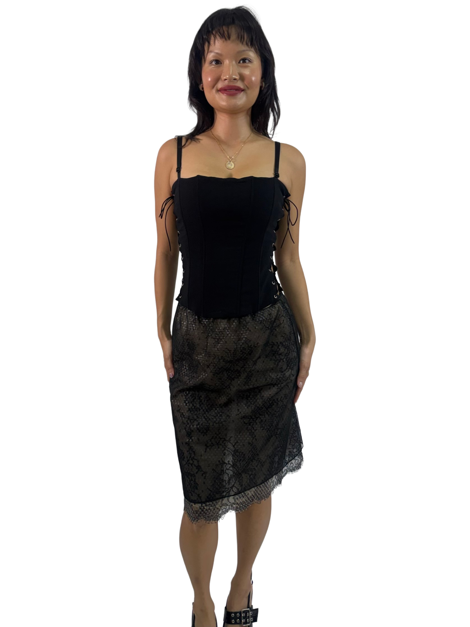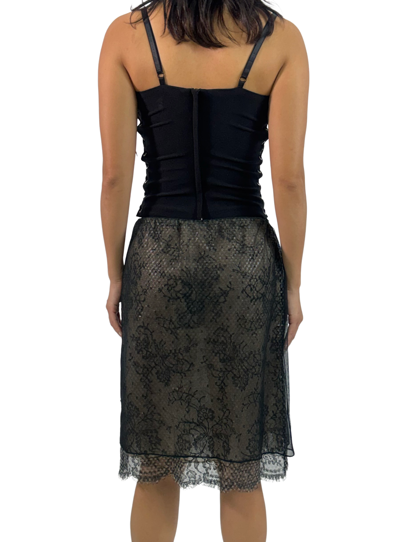 Who says lace is for aunties? This is brat. Designed by Tom Ford, this sheer lace skirt is romantic and edgy thanks to its elasticated leather waistband.