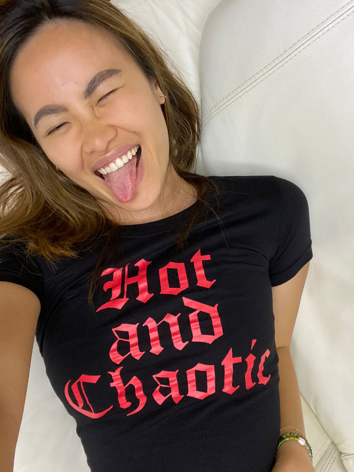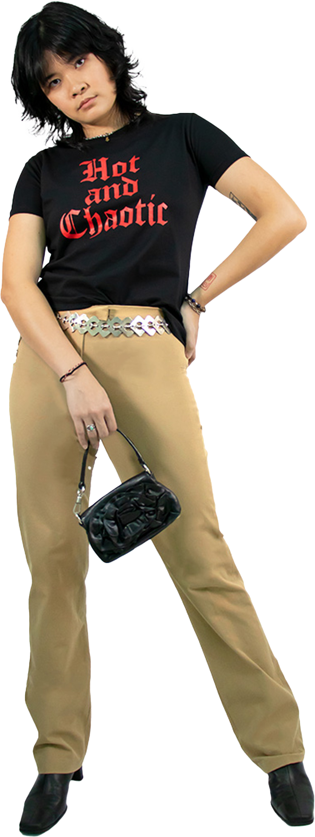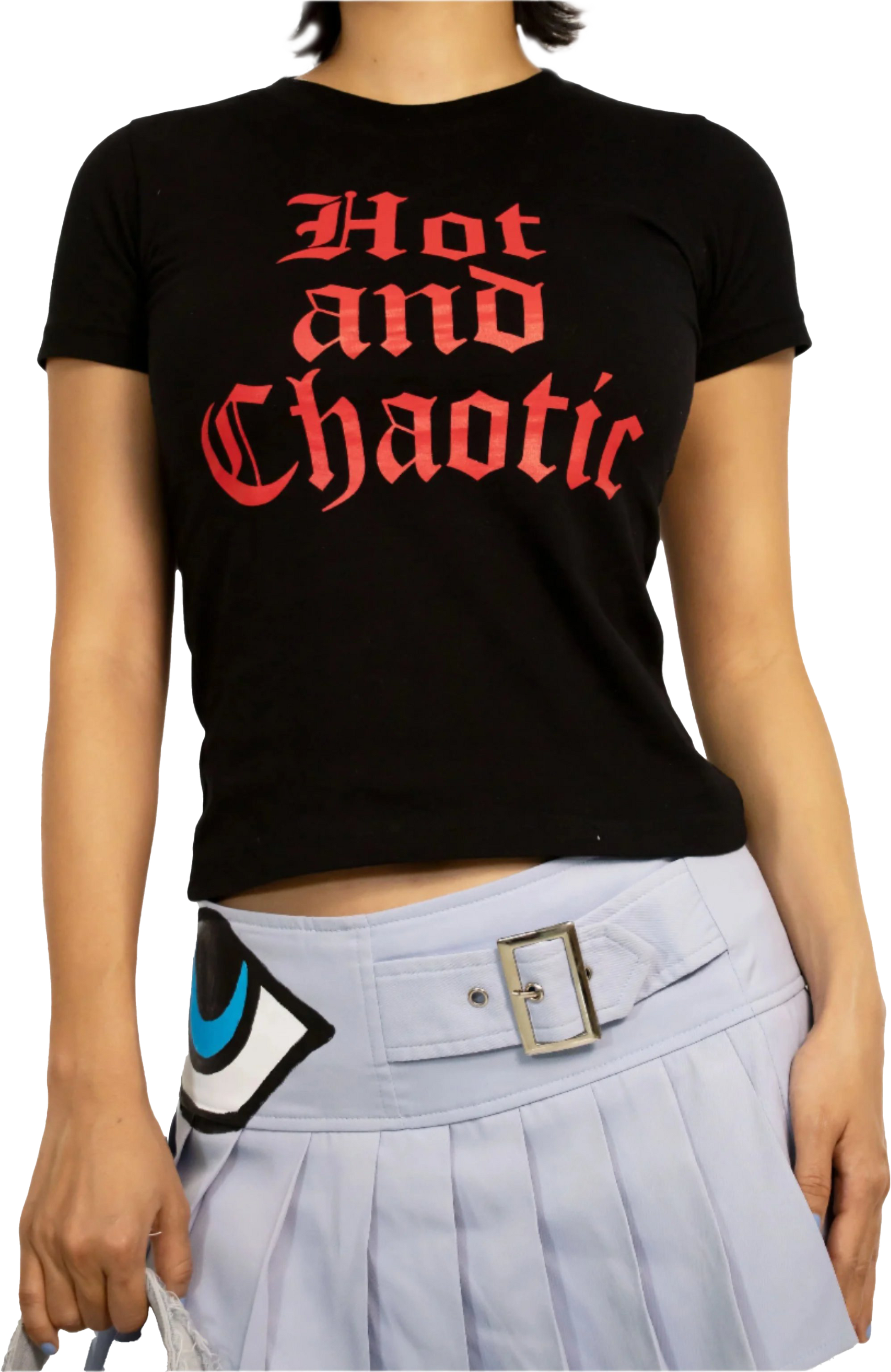 Stirring chaos has never felt this hot. Own your own chaos in this super cute '00s inspired baby tee with a slogan designed by the founder. Make it wholesome with a pastel skirt or be extra devilish with red vinyl pants.