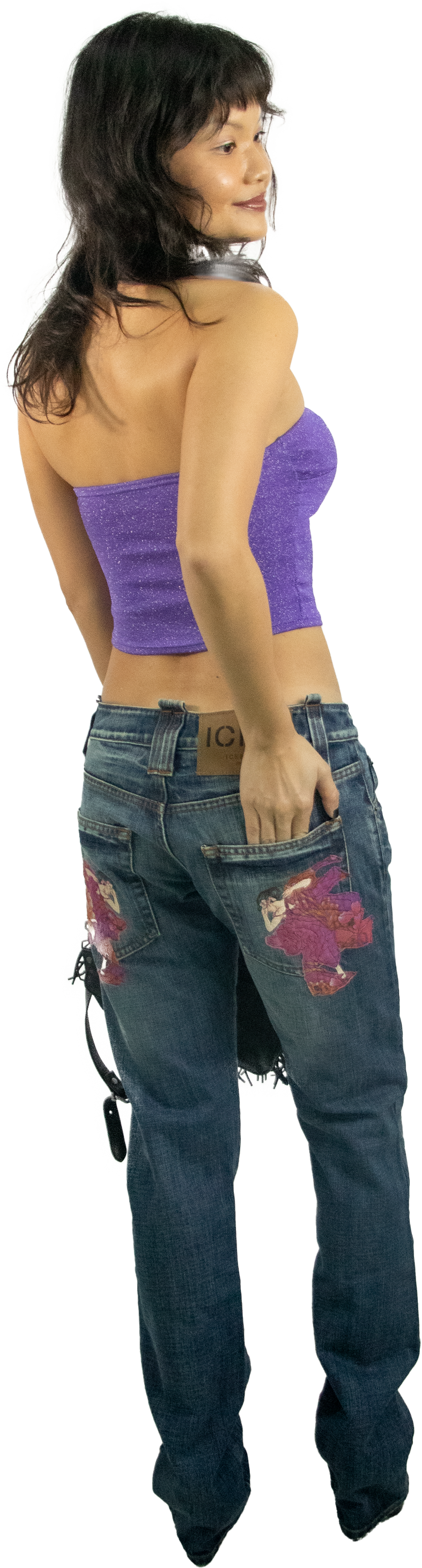 Low rise and straight, these Italian designer jeans sit perfectly low at the hips for that classic Y2K look. It's got tiny belt loops above the waistband that you can leave it as is or loop in a tiny shoelace if you want to make it tighter!