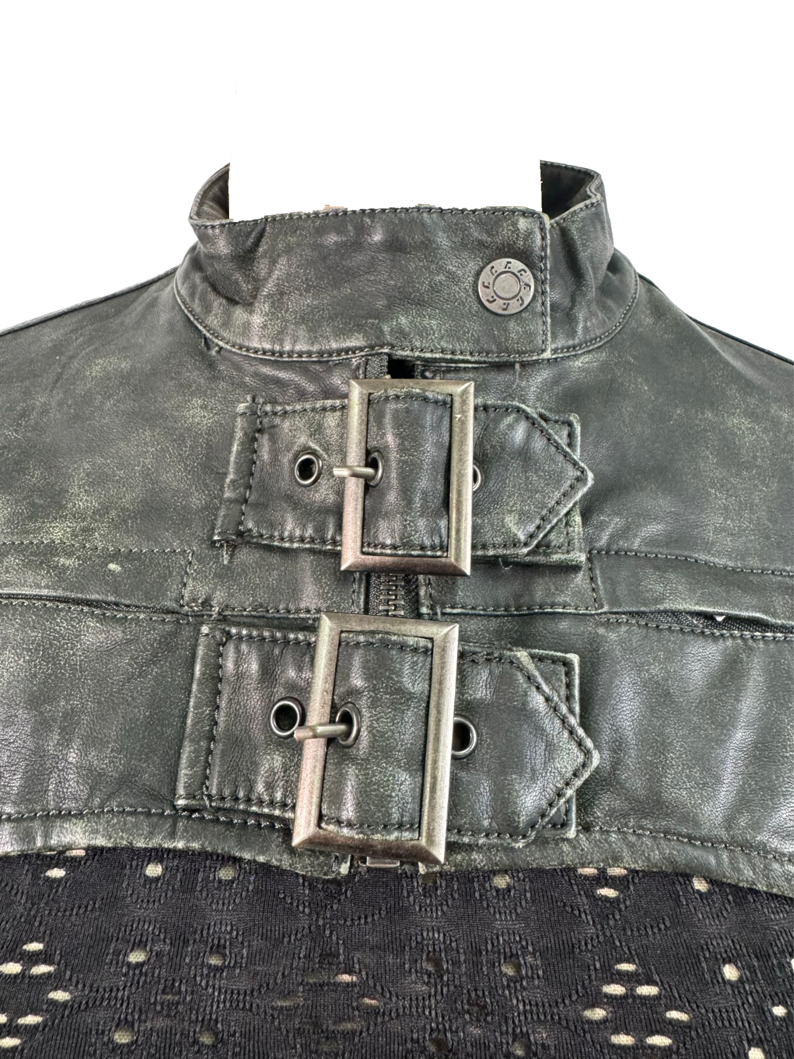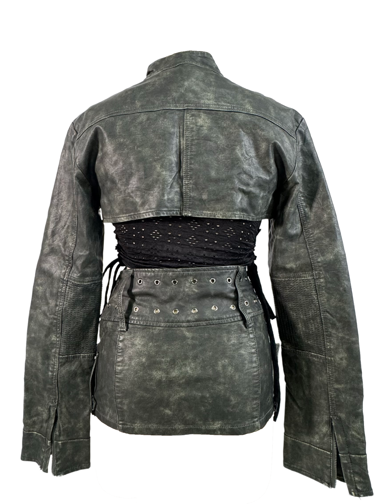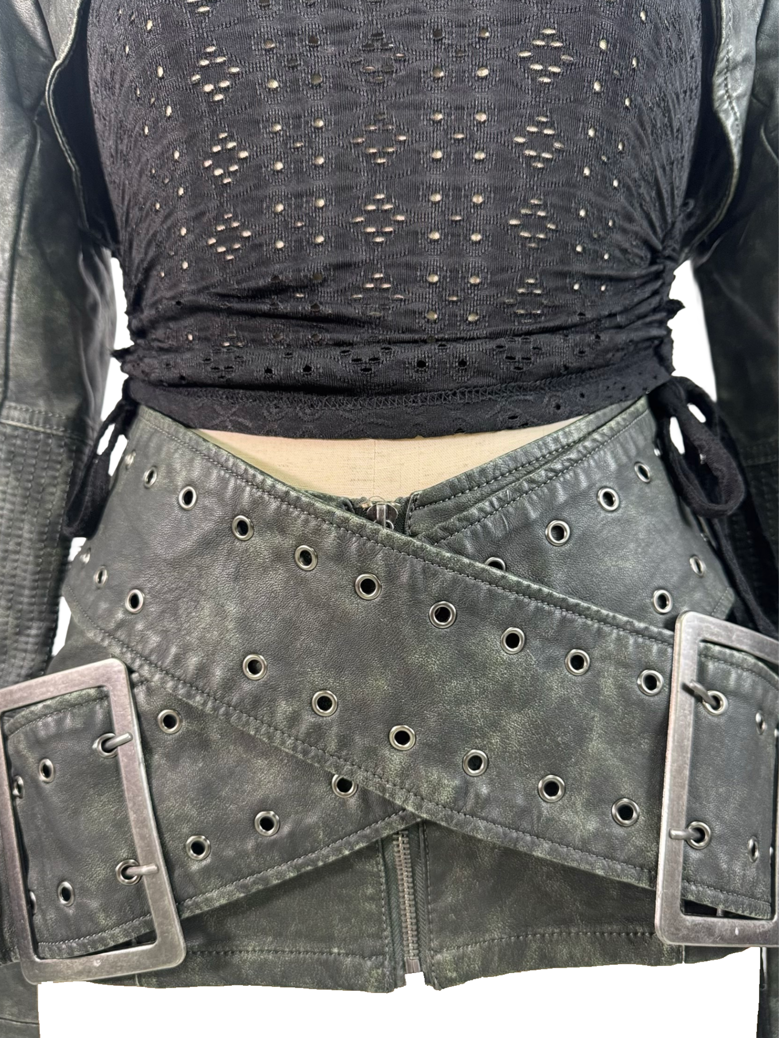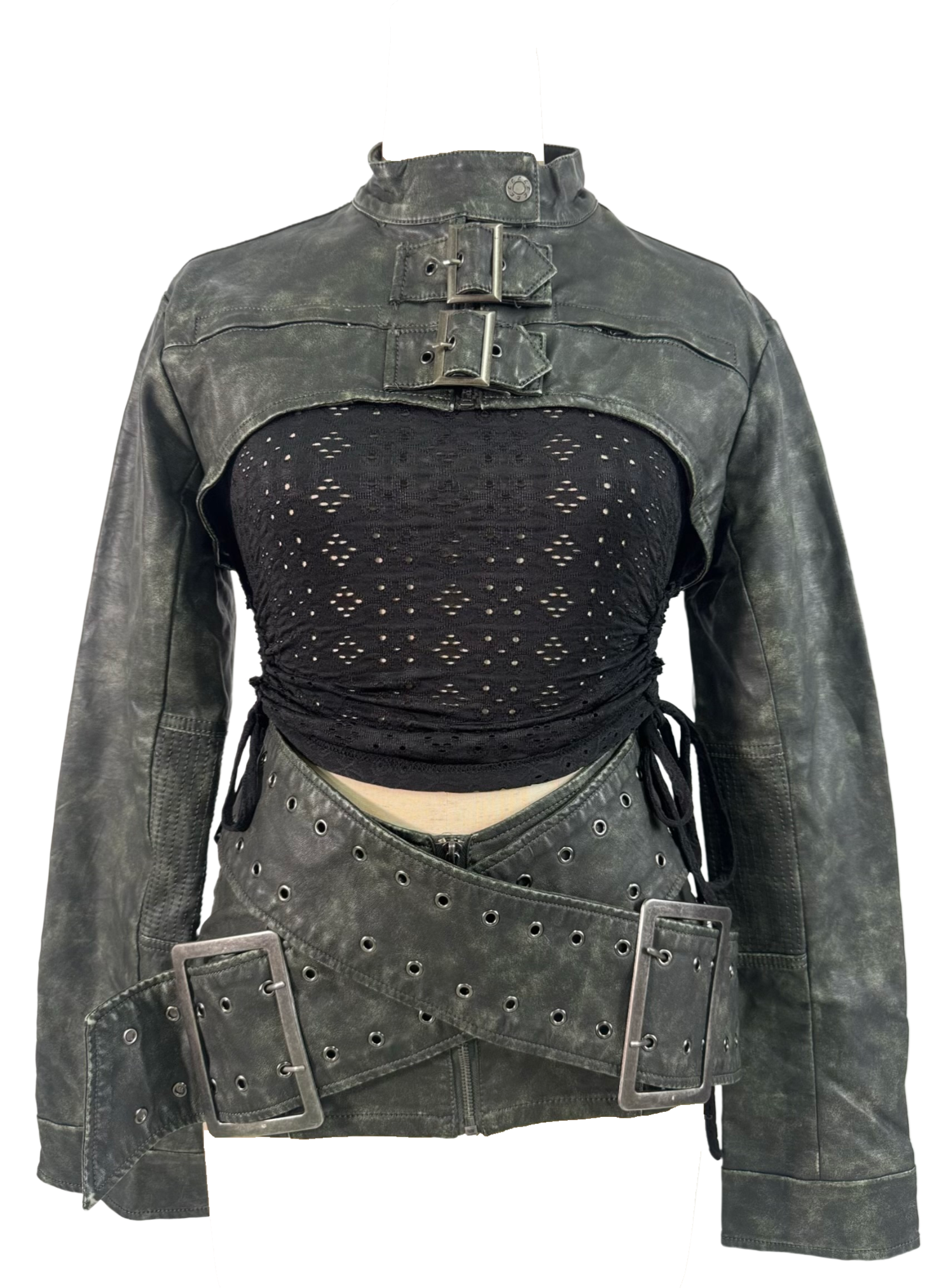 JADED London absolutely understood the assignment with this distressed washed-out green co-ord featuring a cropped bolero-style jacket and a mini skirt with massive overlapping belts that scream high fashion chaos in the best way possible.