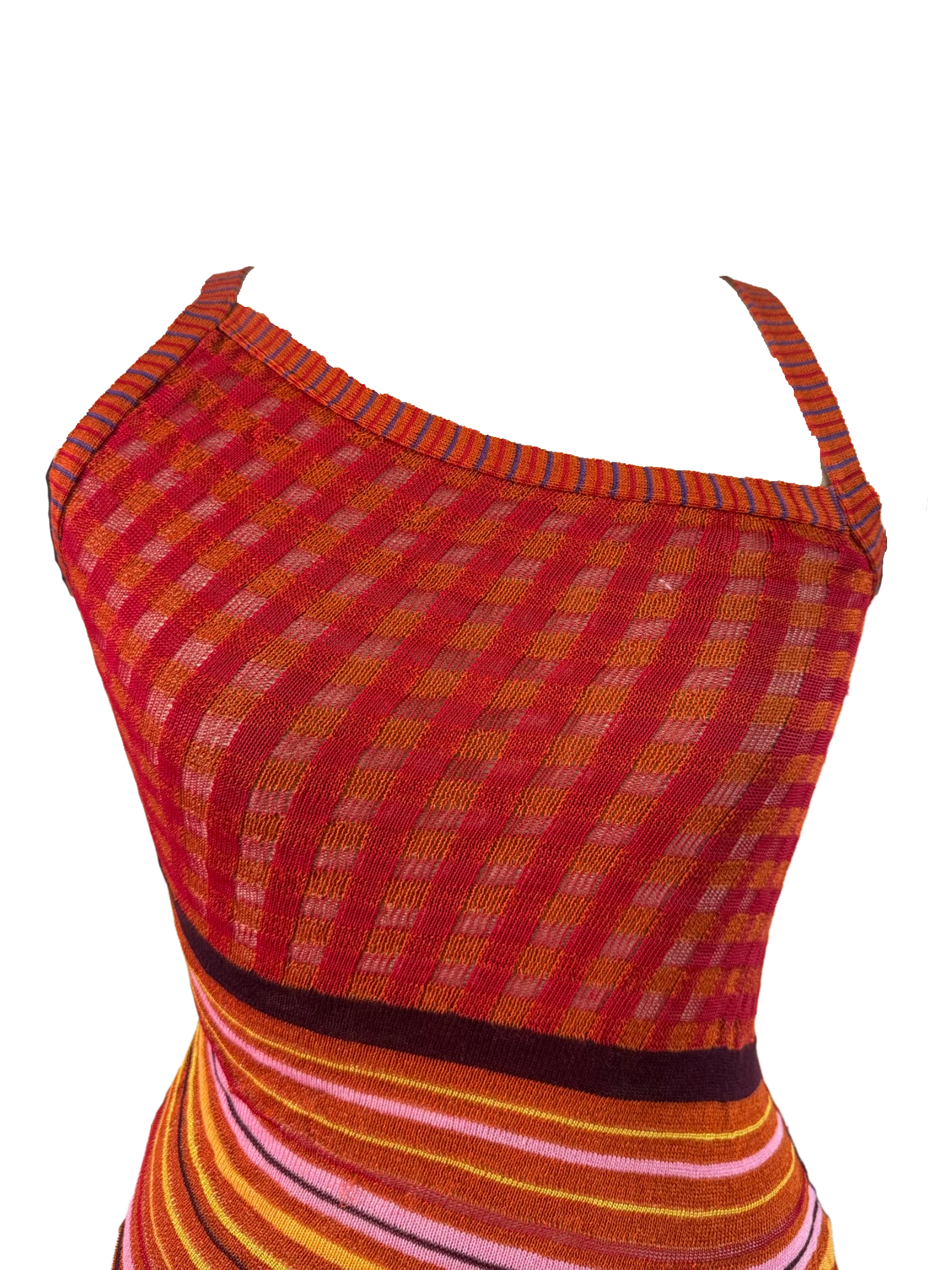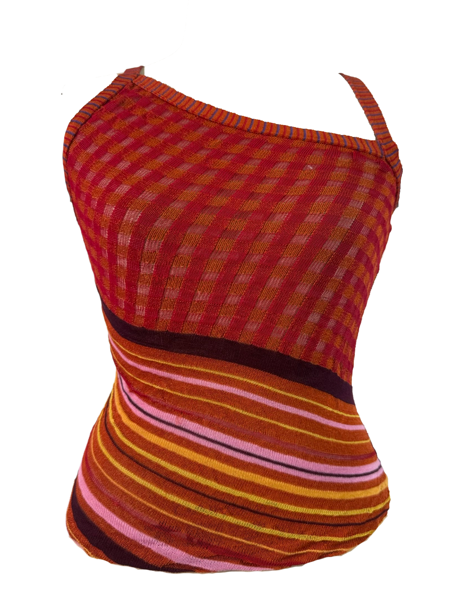 Rare archive-feel knit tank from Kenzo with a bold 70s-inspired palette —burnt orange, deep reds, purples, and pinks in a soft colour block wave. Super flattering fit with a stretchy woven texture. Perfect for fall layering, transitional weather, or styling over a mesh top for that Y2K revival look.