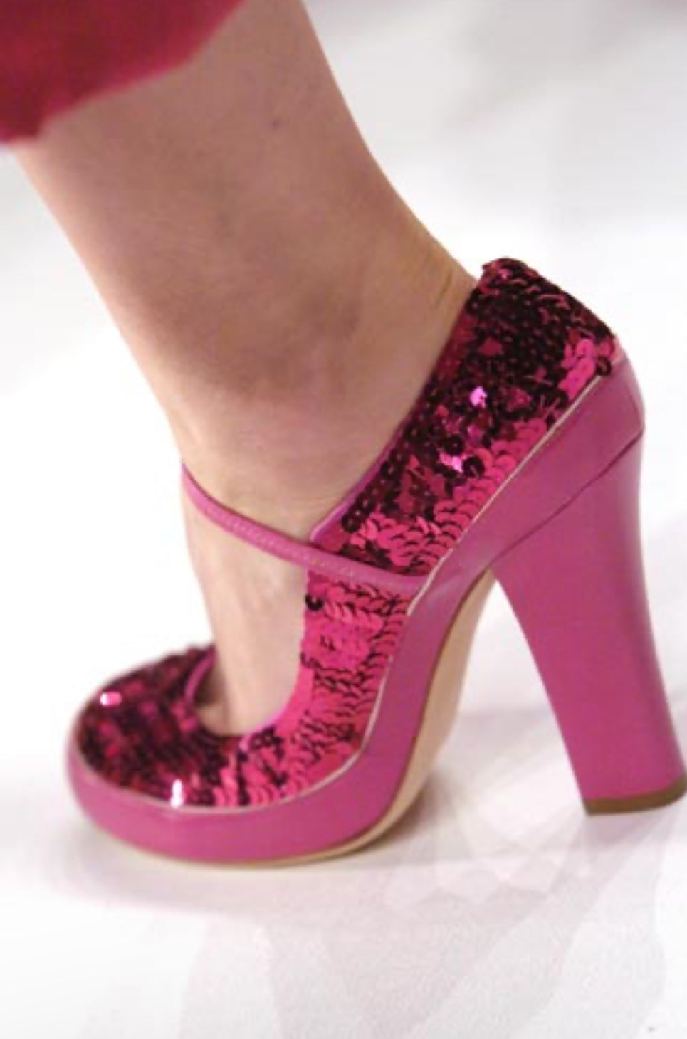 Seen on the S/S 2005 runway, these sequin glitter Mary-Janes have a stretchy leather strap and a block heel.