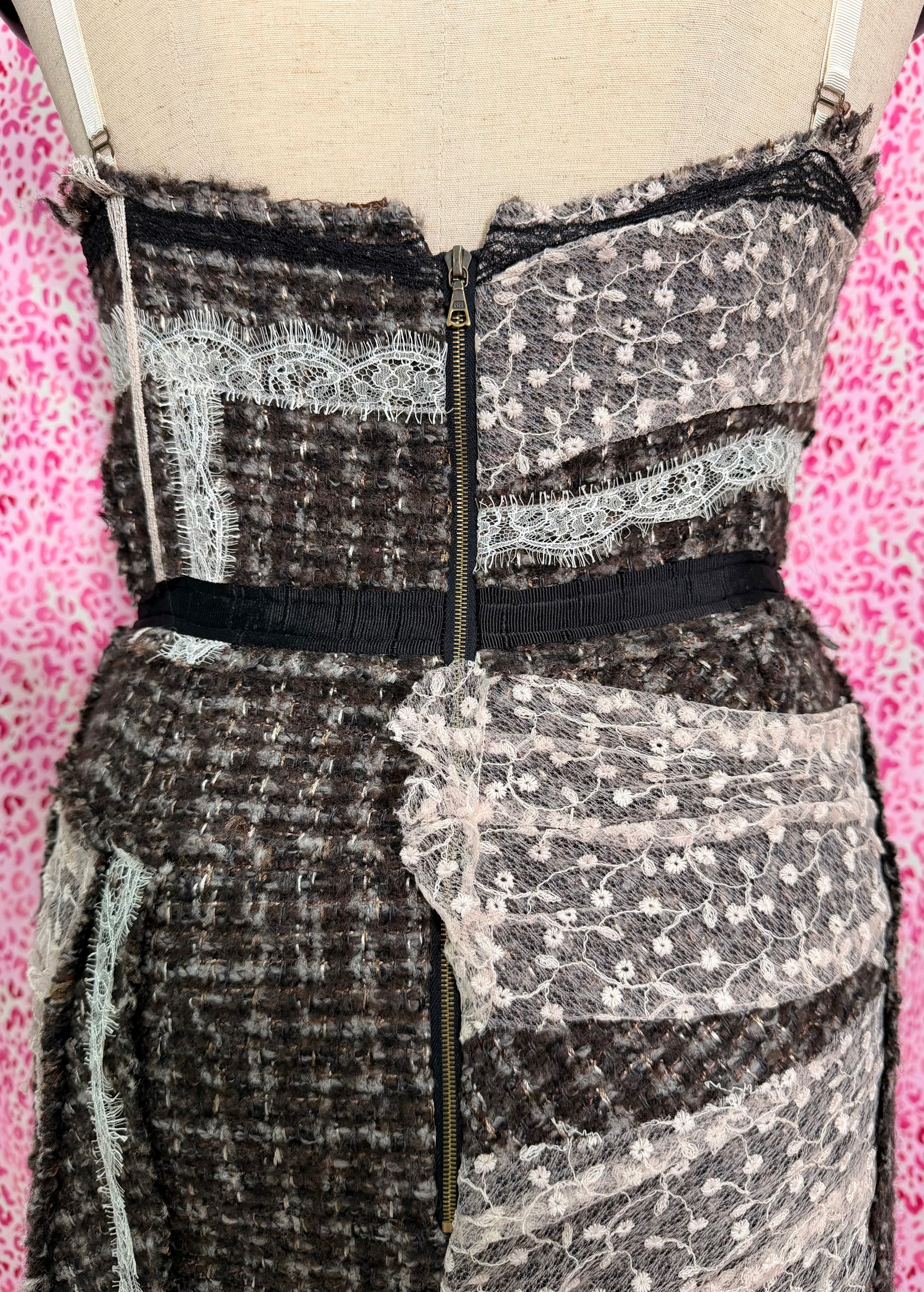 This knee length dress is anything but conservative. Patched up with lace trimmings and panels, this tweed dress features a camisole inspired neckline and slip silhouette that hugs your curves.