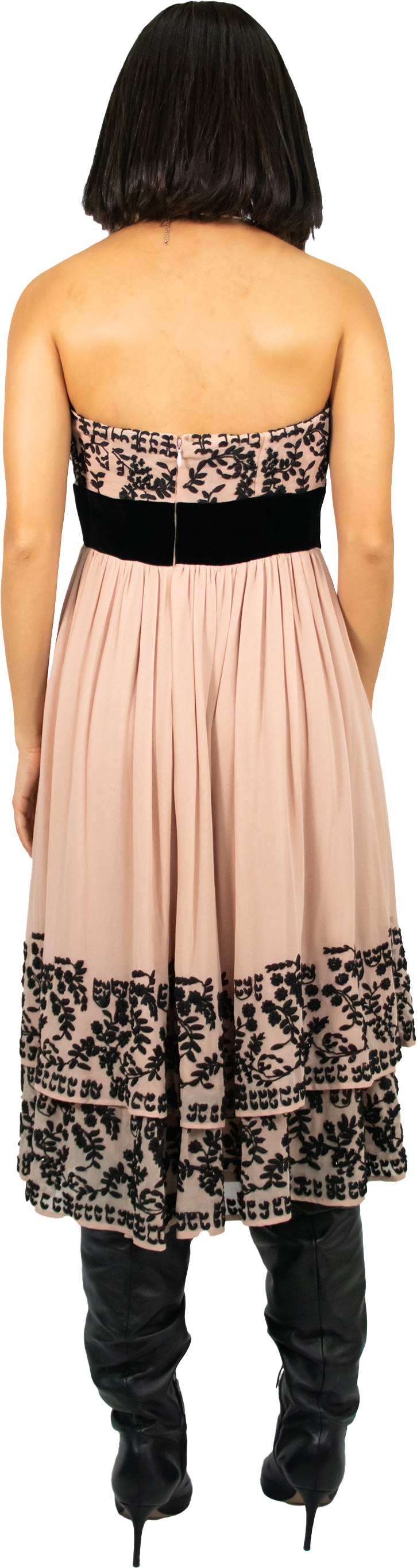Designed in Y2K, this dress features a tiered skirt, embroidered flowers and a big velvet bow. The zipper has been replaced.