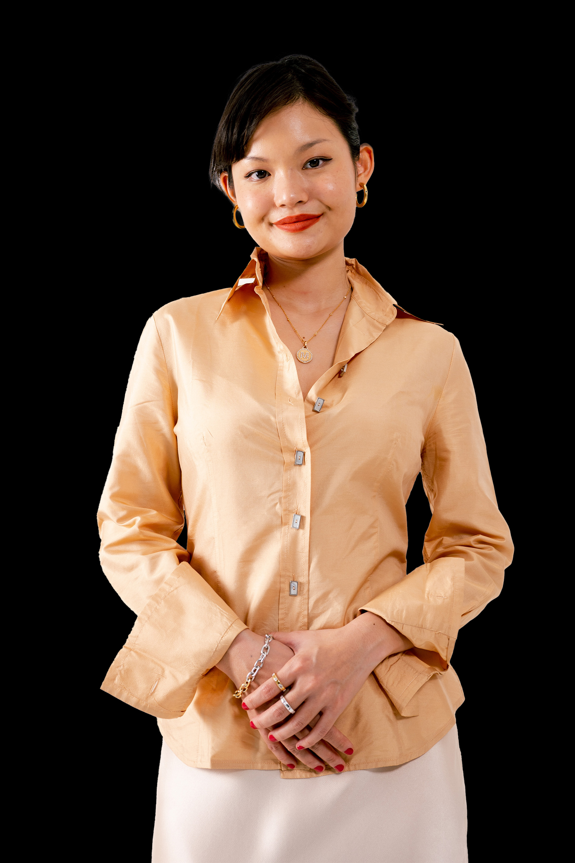 Crafted from silk, this soft peach sorbet shirt features pearl buttons and cufflinks. All buttoned up or partially unbuttoned, all heads will turn on you. It looks similar to this shirt from the Valentino runway for SS 2002.