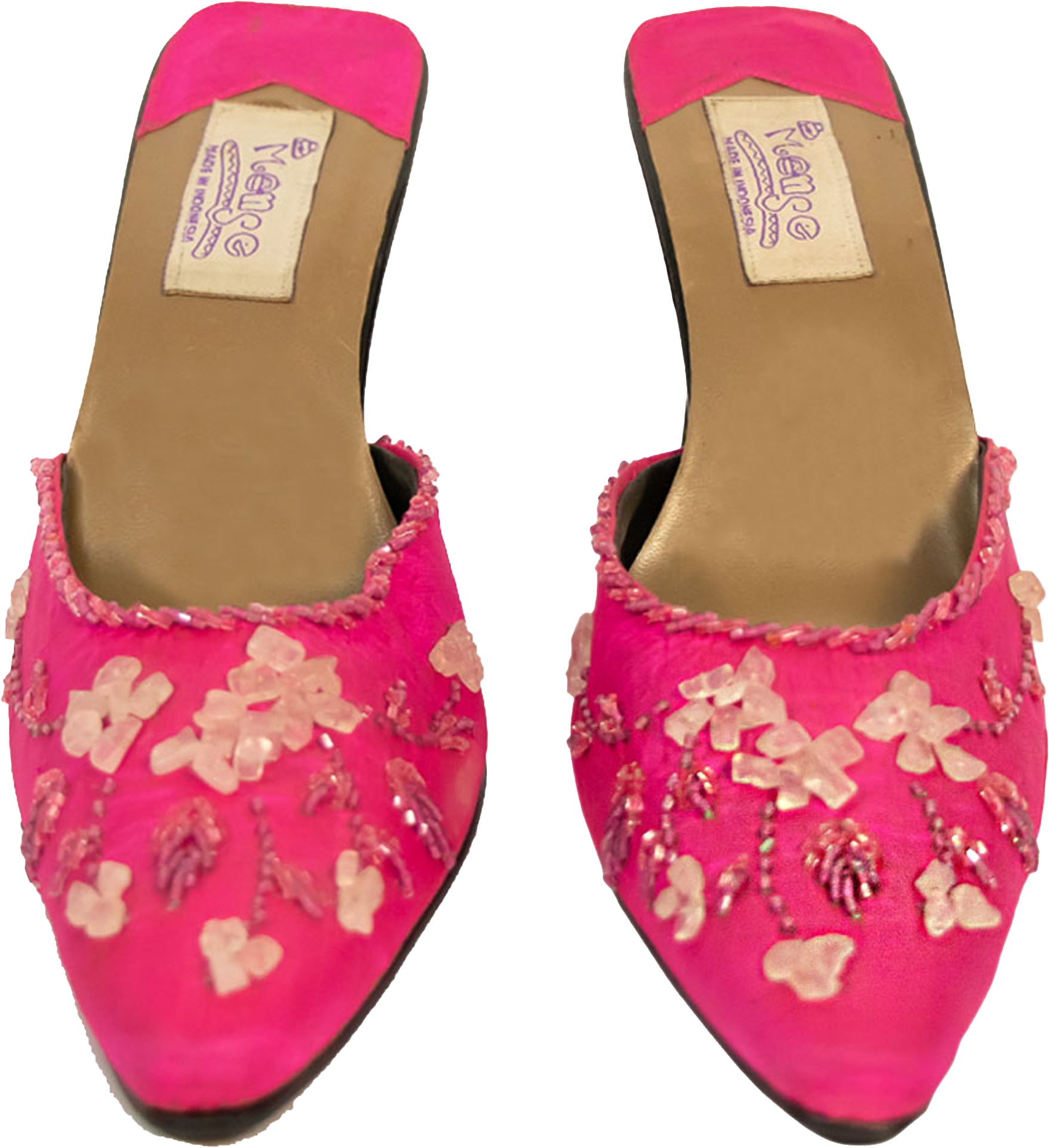 Designed and made in Indonesia, these pink pointy toe beaded shoes are peak Barbiecore.