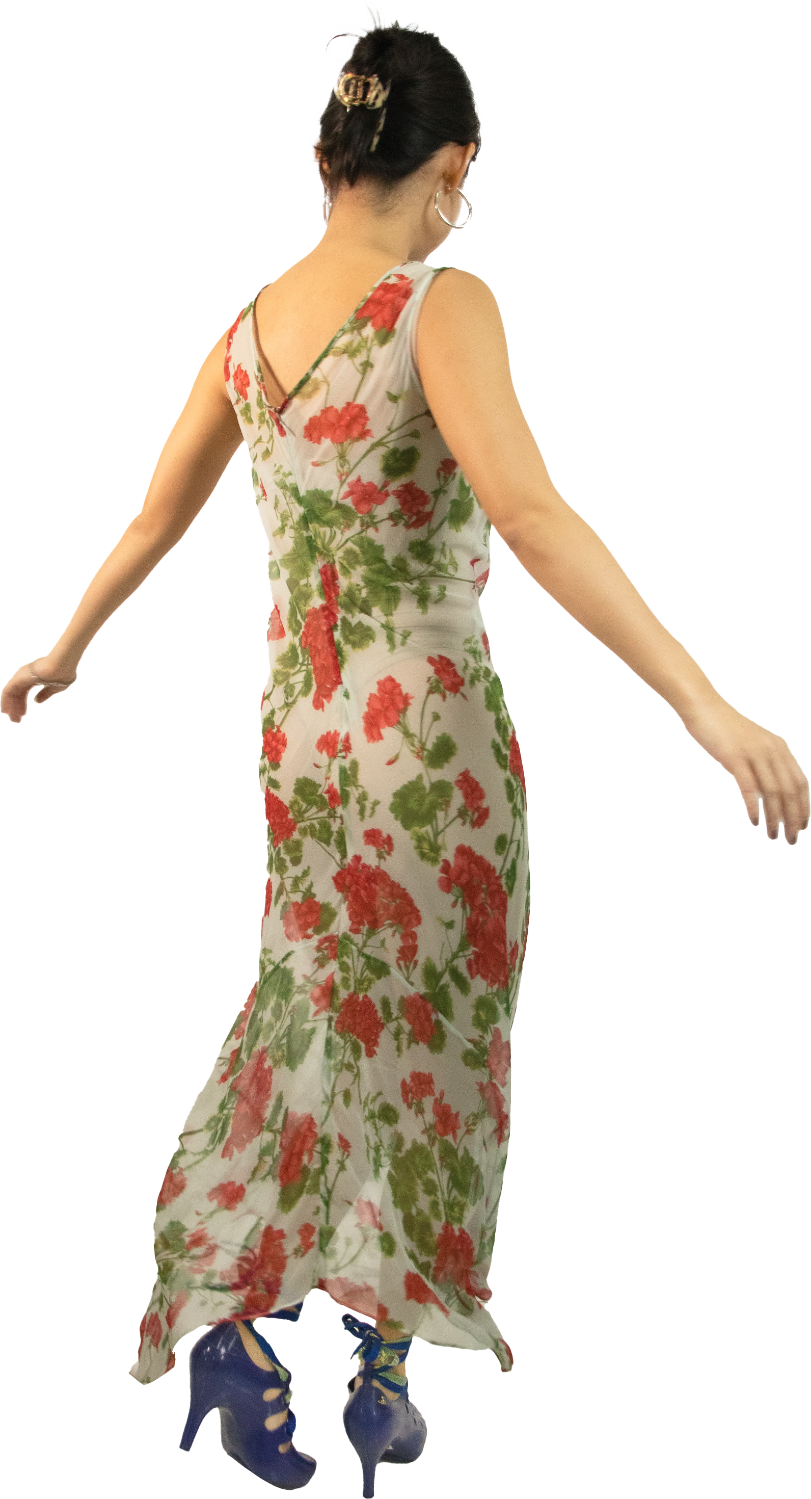This chiffon silk dress features a V back and was a custom made creation for its previous owner. This gorgeous sheer gown can be worn with red or black undergarments for a daring effect or with a nude slip dress for a more demure effect.