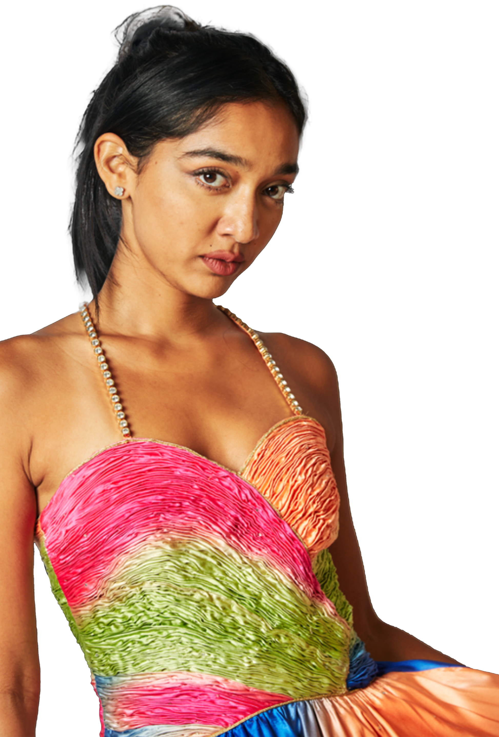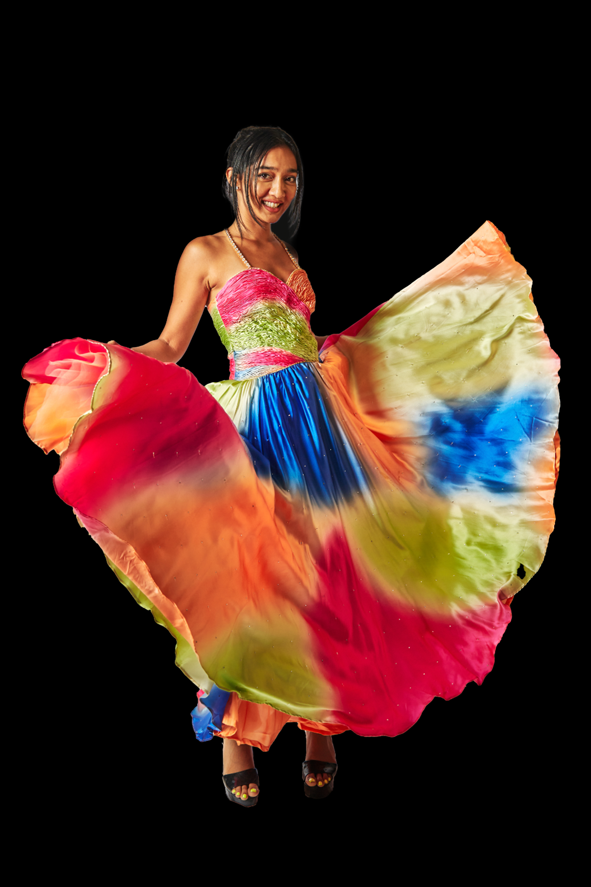 Britney Spears would eat her heart out for this gown. Crafted in silk, this rainbow dyed dress features rhinestones glued on the fabric and rhinestones sewn on the straps. This was created by the founder’s grandmother.