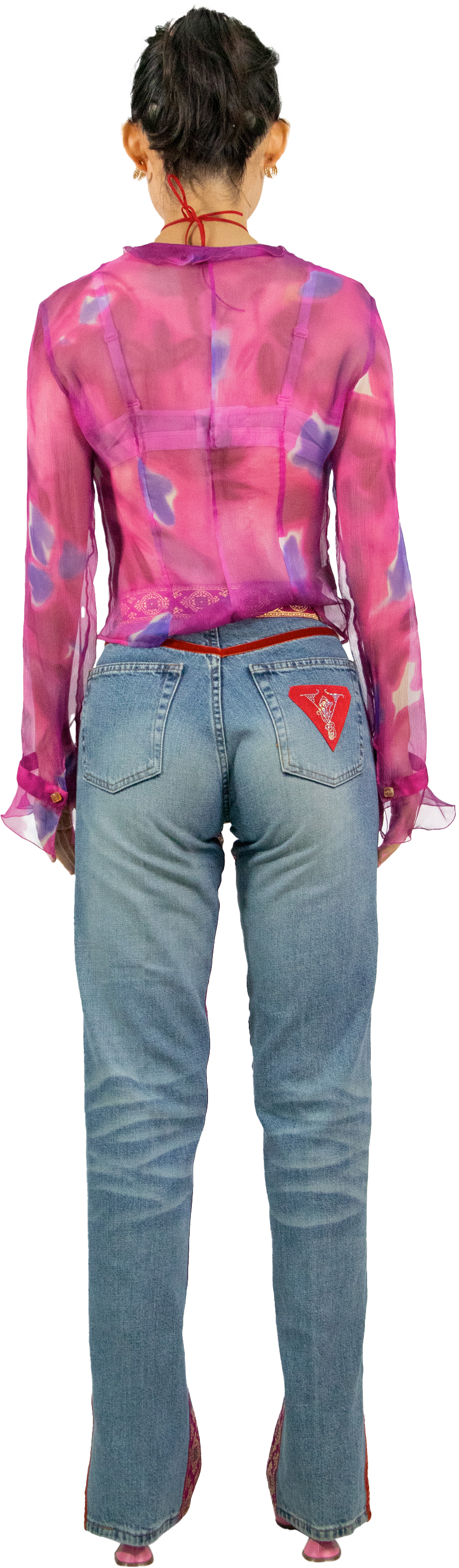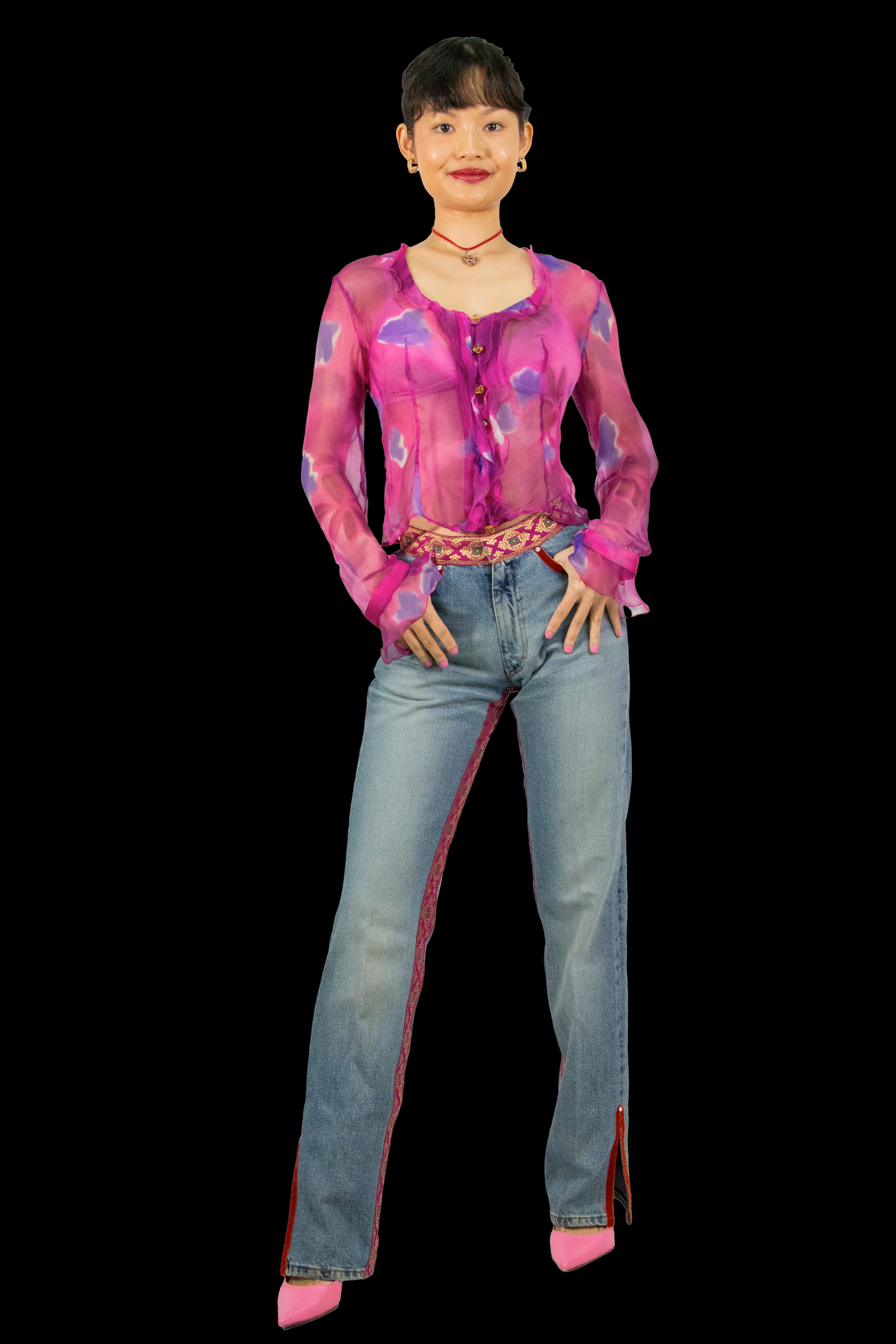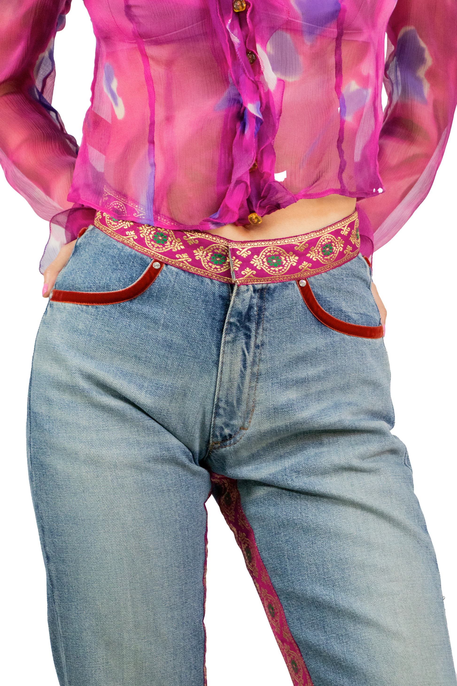 This British brand, Voyage Passion, was known for their embroidered and embellished garments from the early '90s to 2002. Jeans like these are so hard to find as the brand was so popular among celebrities from Kate Moss to Julia Roberts. It features a sari pattern on the inner leg and velvet trim at the split hem and pockets. They used to retail close to £1000.