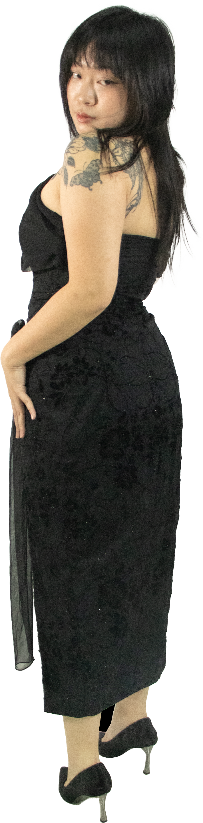 A local Sydney brand, Shuteboss was famous for their formalwear. This dress comes with a built-in scarf and flocks of velvet. Featuring a slit at the thigh, the dress allows you to tear up the dance floor at night!