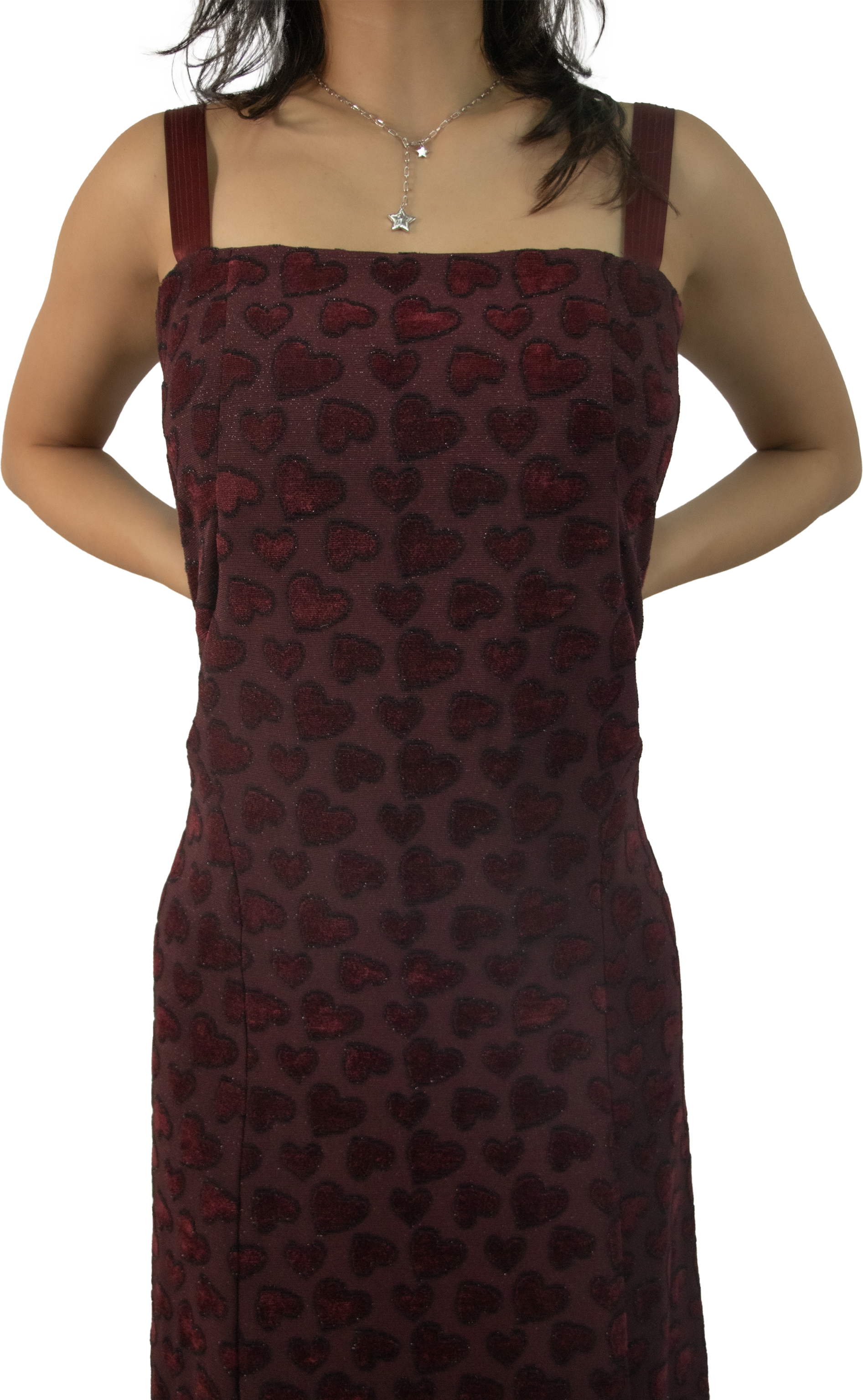 Designed and sewn by the founder’s grandmother, this midi length gown features a mesh lining and contoured seams.